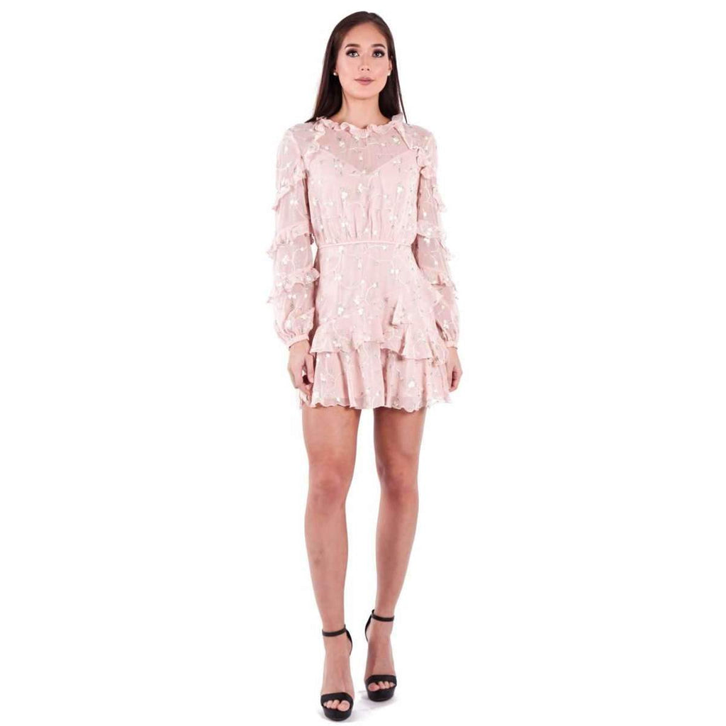 A sweet standout for all occasions. Designed in a floral embroidered georgette this fit and flare mini features gathering along the neckline, full and flared sleeves gathered into cuffs, bias cut and trimmed frills layered around the sleeves and bias cut frills which cross over the front of the A-Line skirt.