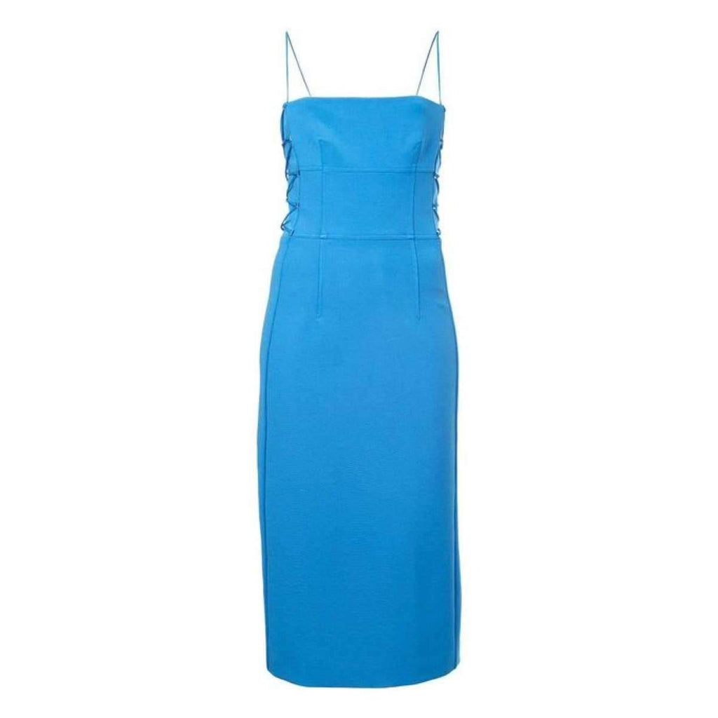 A sleeveless fitted dress fabricated from an Italian power stretch. Features a square neck & back with panelled darts. Finished with roleau spaghetti straps which are laced through the silver hardware detail along the bustier.