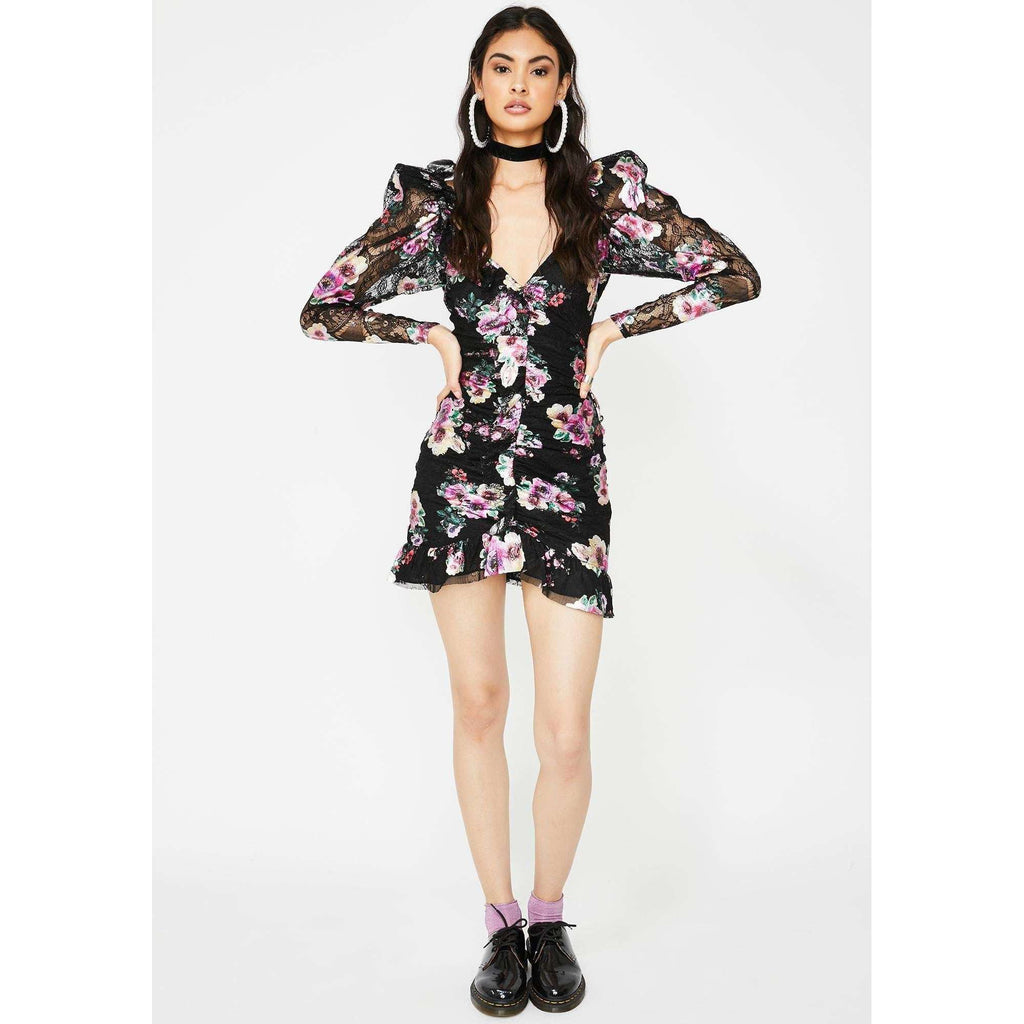 Hit 'em with your best shot in the Benatar Ruffle Mini Dress. This number features foil floral lace, a deep v-neckline, a scoop back with an adjustable tie, a raw edge hemline, and removable shoulder pads. Super cute for any occasion.