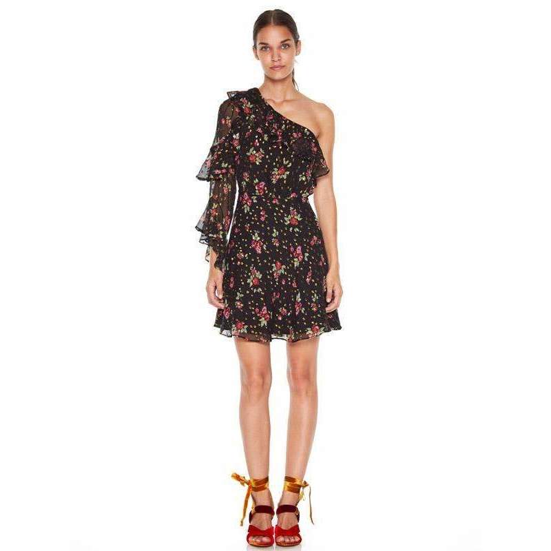 A sophisticated mini with a sweet twist. Crafted in a silk lurex blend, this fit-and-flare mini features stunning frills along the neckline and sleeve.