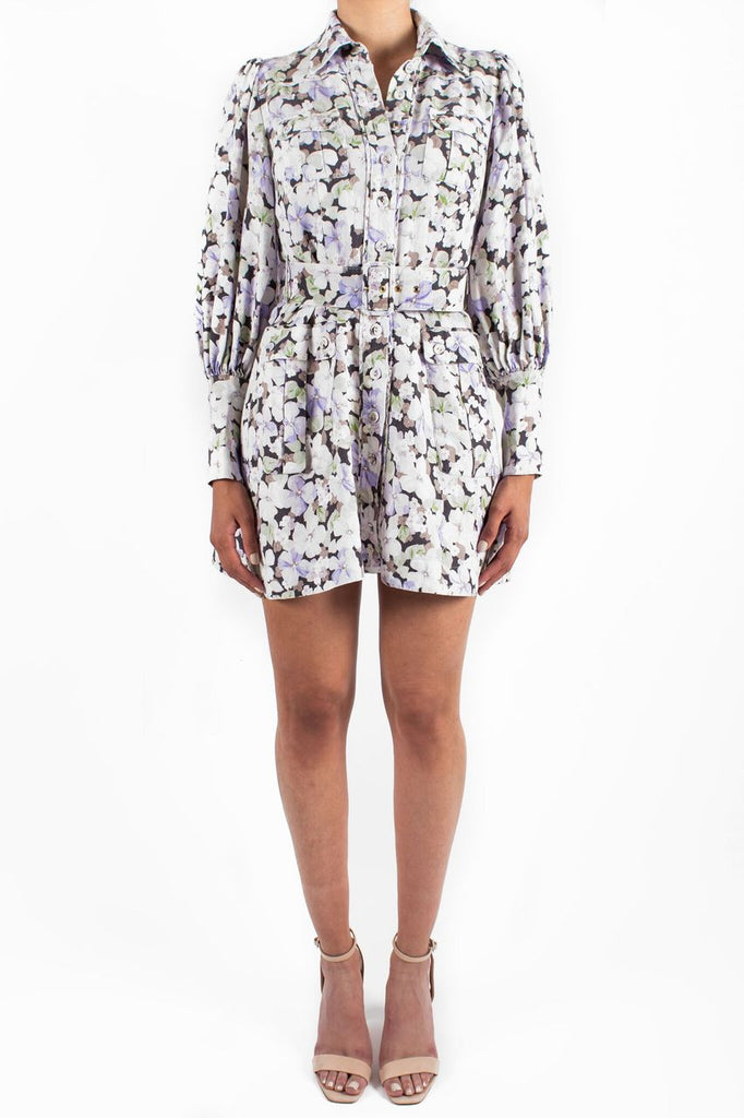 Ninety-Six Shirt Short Dress in Pansy from Zimmermann's Spring 2019 Ready To Wear Collection. This bold linen mini dress features a tailored bodice with belted waist and exaggerated blouson sleeves.