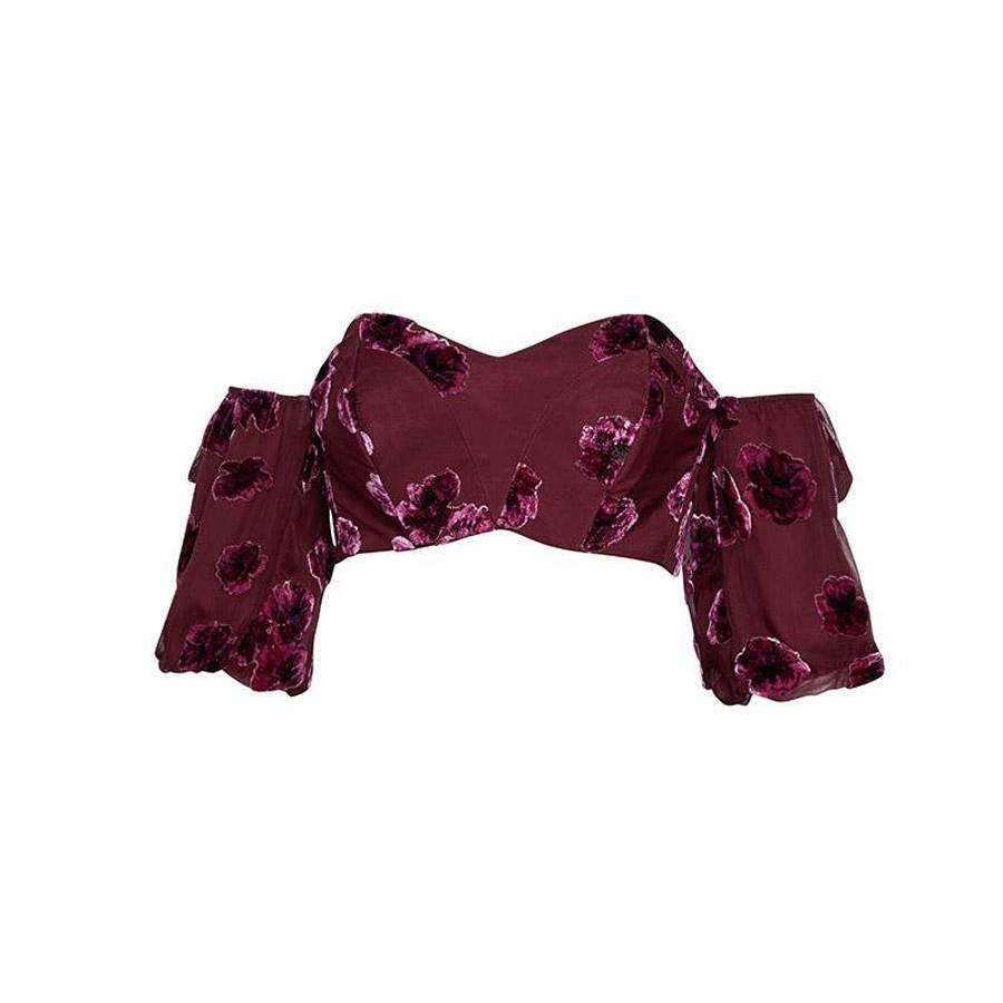 Show a little skin in the Sophie Velvet Floral Top. From its flattering strapless neckline to its structured boning, this gorgeous pansy velvet chiffon burnout crop top is complete with partial lining, grip tape and an exposed hook-and-eye closure. Pictured with the Sophie Velvet Floral Skirt.